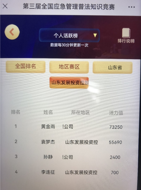 此次主題為“增強(qiáng)法治觀念,推進(jìn)依法應(yīng)急”競(jìng)賽活動(dòng)為期一個(gè)月,分為集訓(xùn)營(yíng)、實(shí)戰(zhàn)營(yíng)、總決賽等三個(gè)階段。東華物業(yè)公司高度重視此次競(jìng)賽活動(dòng),委派東華園安全負(fù)責(zé)人黃金雨同志參賽。黃金雨同志深入學(xué)習(xí)競(jìng)賽活動(dòng)內(nèi)容,圍繞安全生產(chǎn)和應(yīng)急管理普法工作,仔細(xì)研究法律法規(guī)條文,及時(shí)跟蹤競(jìng)賽活動(dòng)進(jìn)展,準(zhǔn)確把握競(jìng)賽活動(dòng)要求,做到學(xué)法、知法、懂法、用法,以賽促學(xué)、學(xué)以致用,最終取得山東發(fā)展投資集團(tuán)個(gè)人活躍榜第一名的優(yōu)異成績(jī),為公司爭(zhēng)得了榮譽(yù)。