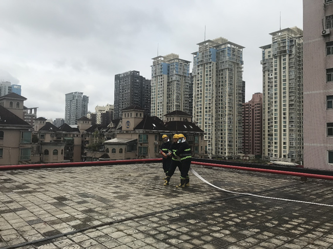 在消防安全實操演練中,義務消防員接到孵化器工業園8樓頂層“火警”通知后,三分鐘內按標準規范要求熟練穿戴好防護服,迅速進入“火災”現場進行撲救,后續支援消防隊員五分鐘內抵達“火災”現場進行援助,在做好“火災”撲救工作的同時,組織群眾迅速疏散。