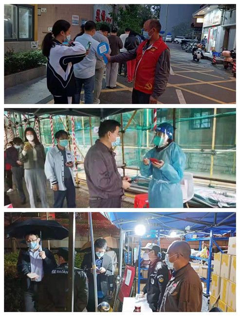哪里任務重、風險大,哪里就有志愿者的身影。東華園區人數眾多,園內設有兩個核酸檢測點,分為下午和晚上兩個檢測時段,現場容易出現居民扎堆排隊的情況。志愿者們不畏艱險、迎難而上,勇敢深入核酸檢測一線,積極承擔起掃碼錄入資料、監督核查綠碼、維護現場秩序的職責,極大地減輕了社區工作站的防疫壓力。他們當中年紀輕者努力適應著派管、掃碼、核對身份信息的流程,盡力平衡著檢測速度和審核信息的時間矛盾,小心翼翼、認真謹慎;年紀稍長者努力克服操作不熟的技術障礙和身體精力的不濟,頂著居民群眾不理解、不配合所帶來的委屈和壓力,平心靜氣、兢兢業業。年近六旬且一只眼睛近乎失明的鄧輝進,身披防護服沖在防疫一線堅守一整個時段,讓人敬佩和感動。