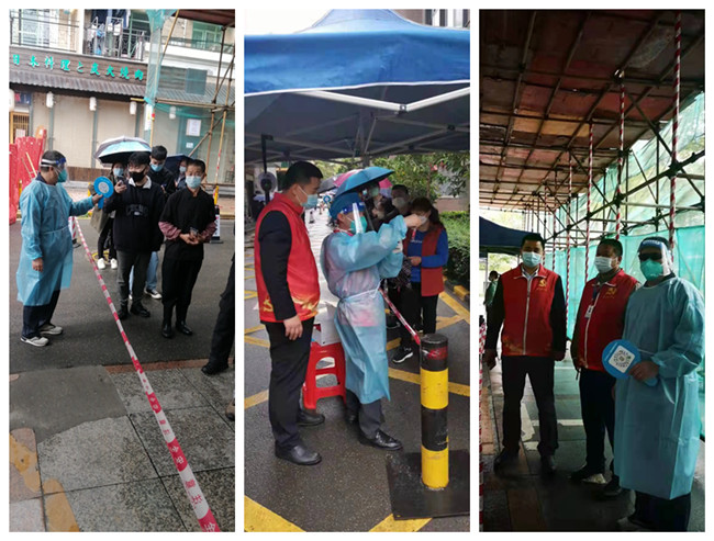 解封不解防。經過前段時間的持續奮戰,東華園區恢復了正常運行,企業陸續復工復產,居民群眾又開始了忙碌的日常,給園區疫情防控工作帶來了巨大壓力。作為“保障居民生活和城市基本運行”的物業行業,東華物業公司將抗疫工作放在首位,嚴格按照屬地政府疫情防控要求,加強進出口管控和人員排查、協助核酸檢測,全力以赴守好社區第一道防線。在深圳東華黨委統一領導和廣大黨員干部示范引領下,東華物業公司黨員群眾迅速集結,由黨員高秀德,入黨積極分子黃金雨、康國超,民盟盟員王英才子,基層員工胡方均、蘇迎清、鄧輝進、曾俊文、張秀青組成的志愿者隊伍,以一往無前的姿態積極主動地參與到“勇于擔當、抗疫有我”的志愿服務行動當中。