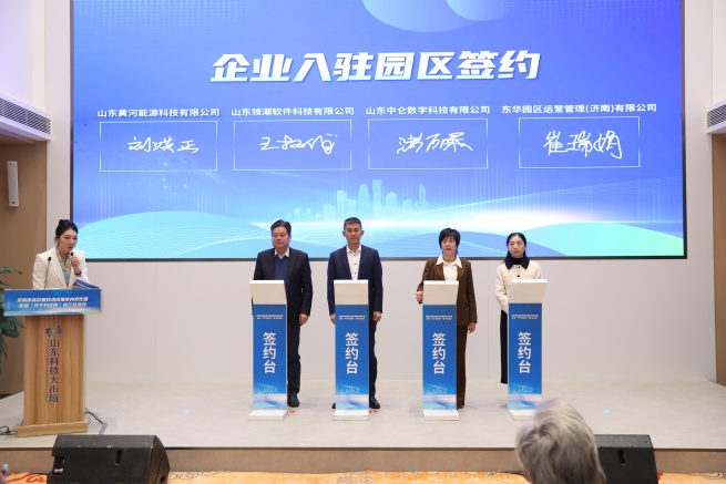 濟南市高價值技術成果市內轉化暨首屆“歷下好成果”推介會由省科技廳指導,濟南市科技局、市發改委、市工業和信息化局、市民營經濟局、歷下區委、歷下區政府共同主辦,東華濟南園區公司協辦。推介會上,東華濟南園區公司與3家新入駐科創企業山東黃河能源科技有限公司、山東領潮軟件科技有限公司、山東中侖數字科技有限公司成功簽約,標志著東華濟南園區公司加快構建科創性企業服務生態圈取得新突破、邁上新臺階。