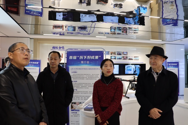 在濟南國際人才創新中心,張成一行聽取了園區在企業培育、成果轉化、人才引進以及服務體系搭建等方面的詳細介紹,實地調研了園區功能區域和黨群活動中心。在“歷下好成果”展廳,詳細了解了歷下區在科技榮譽、研發平臺、科技人才、國際合作等方面所取得的成績。張成一行參觀了中國首位諾貝爾生理學或醫學獎獲得者屠呦呦與山東中醫藥研究院共同研制的青蒿素產品、外籍院士查爾斯團隊研發的善維免疫系列產品、山東大學齊魯醫院與中國科學院院士房建成聯合研發的零磁醫學裝備、俄羅斯工程院外籍院士劉延俊團隊研發的海上波浪能發電裝備等高科技產品,并對濟南國際人才創新中心在推動高校院所、科技企業創新成果轉化方面所做出的努力給予高度認可。