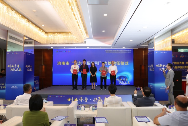 活動中,山東省委組織部人才工作二處負責同志頒發了濟南市“校友雙招雙引大使”聘書,濟南市委組織部副部長、市委人才辦常務副主任王玉躍頒發了“海右伯樂”聘書,“粵港澳濟商產業聯盟”正式揭牌,與會領導共同啟動大賽路演儀式。