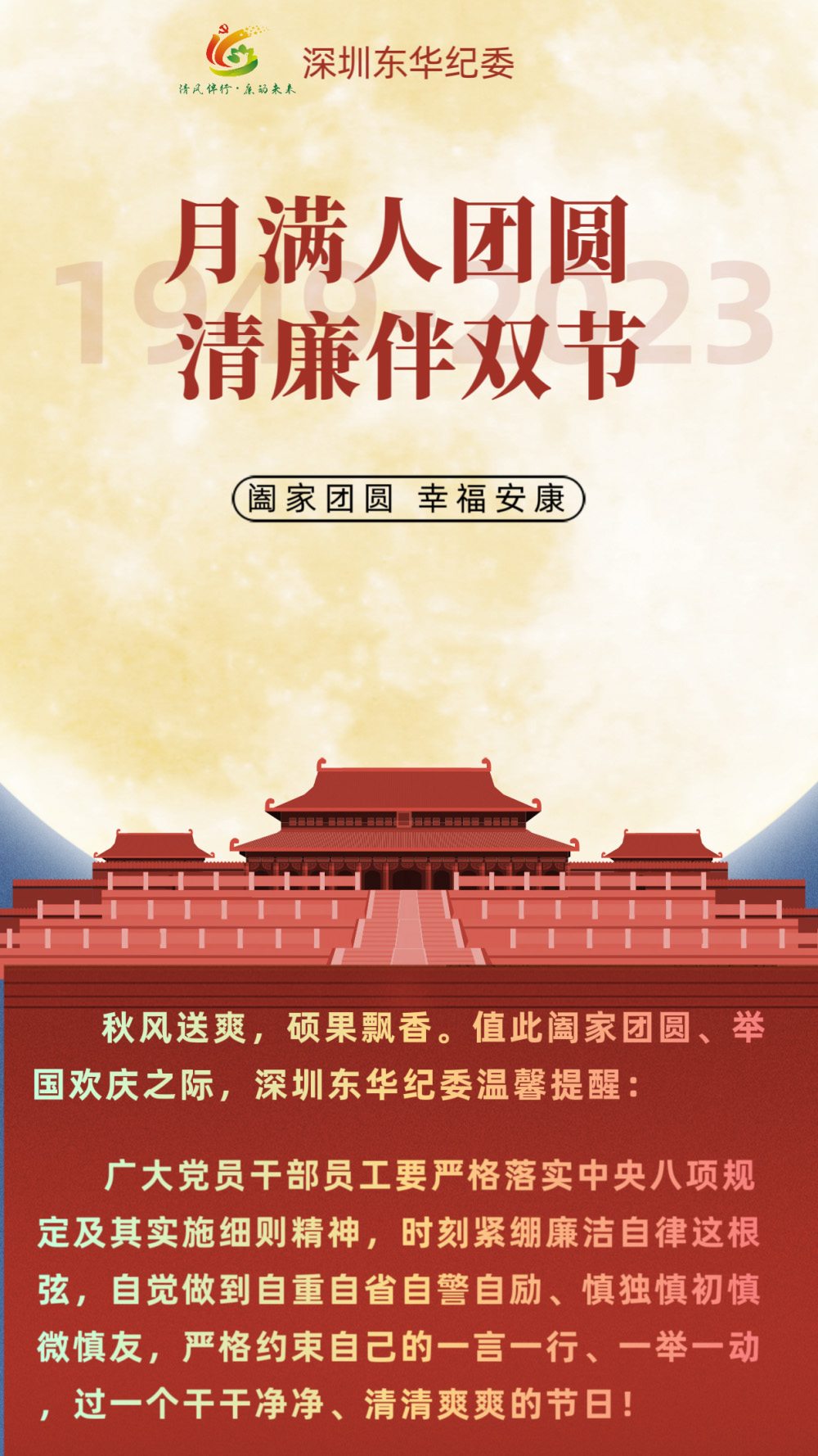 [導讀] 秋風送爽,碩果飄香。值此闔家團圓、國歡慶之際,深圳東華紀委溫馨提醒:廣大黨員干部員工要嚴格落實中央八項規(guī)定及其實施細則精神,時刻緊繃廉潔自律這根弦,自覺做到自重自省自警自勵、慎獨慎初慎微慎友,嚴格約束自己的一言一行、一舉一動、過一個干干凈凈、清清爽爽的節(jié)日!